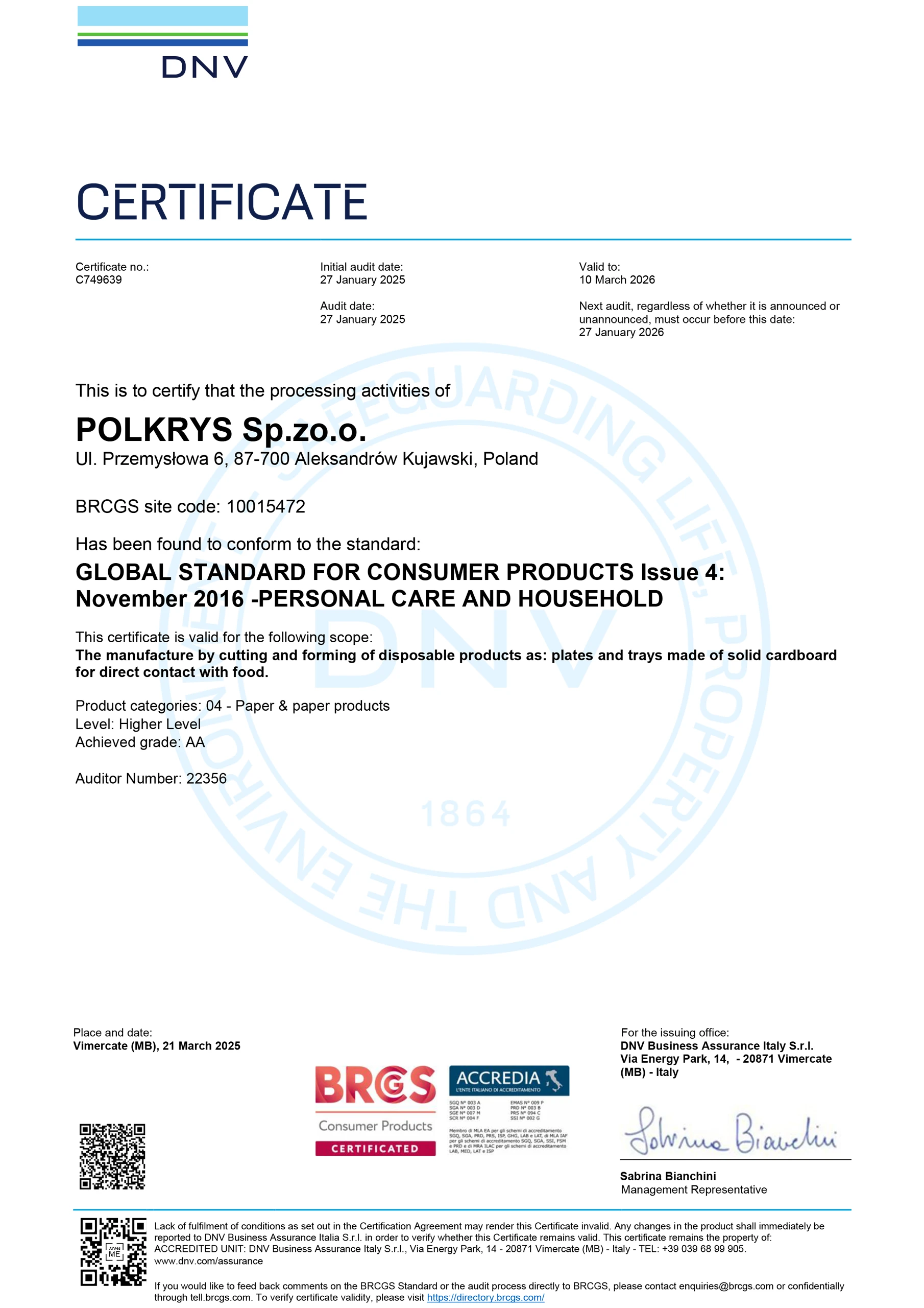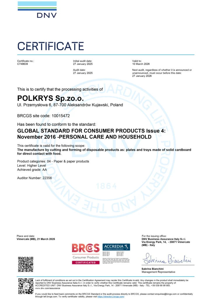 Das FSC™-Zertifikat (Forest Stewardship Council™) verpflichtet POLKRYS zur Einhaltung spezifischer Standards im Zusammenhang mit dem verantwortungsvollen Management von Waldressourcen. Der Erhalt des Zertifikats mit der Nummer BV-COC-137982 bedeutet, dass POLKRYS ein System zur Kontrolle der Lieferkette für Produkte implementiert hat, die Holzressourcen enthalten, wie Voll- und Wellpappe. Dieses Zertifikat bestätigt, dass die zur Produktion verwendeten Rohstoffe aus nachhaltig bewirtschafteten Wäldern stammen, die die Biodiversität schützen und sozial sowie ökologisch verantwortungsvolle Forstwirtschaftsmethoden unterstützen. Das Zertifikat garantiert, dass die Produkte strenge Anforderungen an die Rückverfolgbarkeit der Rohstoffe erfüllen, was den Kunden die Sicherheit gibt, dass sie umweltfreundliche Produkte kaufen.