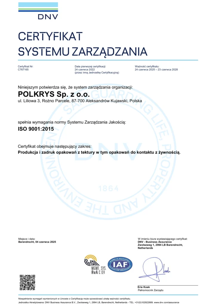 Die Qualität unserer Produkte hat oberste Priorität, weshalb wir fortschrittliche Produktionsmanagementsysteme wie TPM, LEAN und 5S implementiert haben. Regelmäßige Tests der Endprodukte in Zusammenarbeit mit renommierten Laboren wie COBRO, J.S. Hamilton Poland und SQTS gewährleisten die Sicherheit und Langlebigkeit der Verpackungen. Wir verfügen über Zertifikate, die unsere Einhaltung hoher Produktionsstandards bestätigen.
